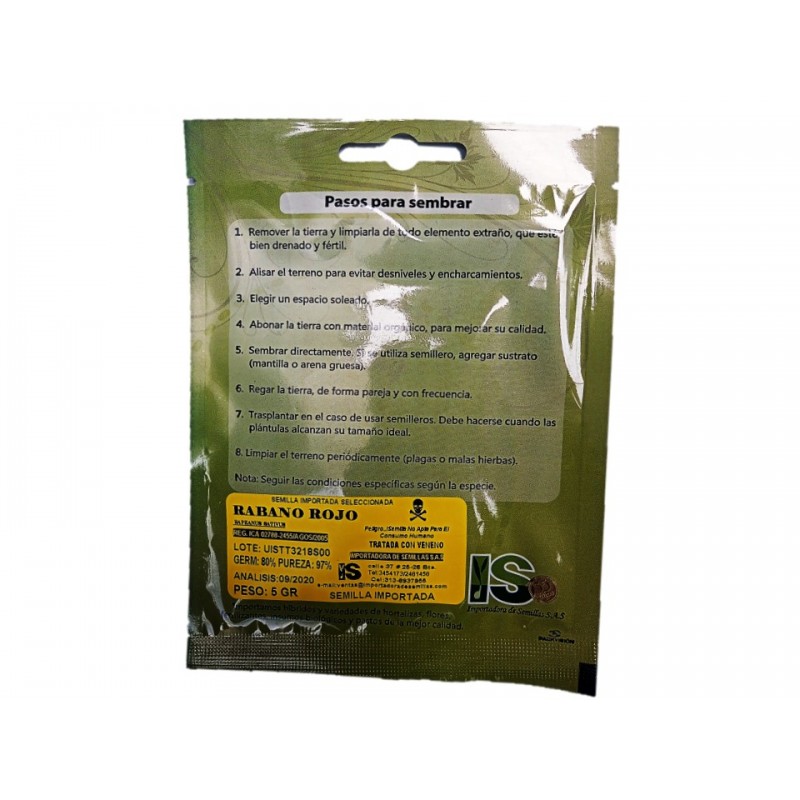 Descripción: Siembra estas excelentes semillas de hortalizas, semillas de Rabano sardo gigante rojo de excelente calidad con un gran porcentaje de pureza (97 %) y germinación (80 %).